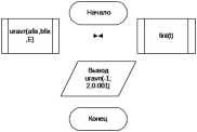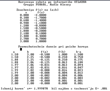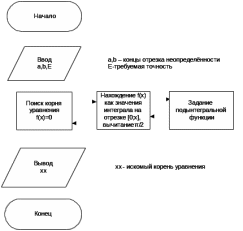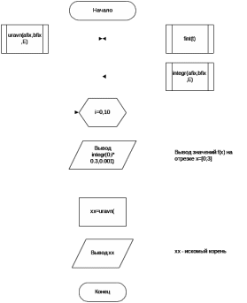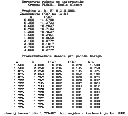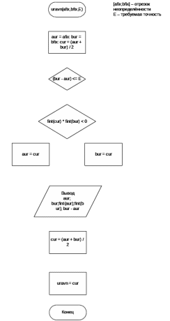 - главный модуль, вводящий исходные данные (требуемую точность и концы отрезка неопределённости) и выводящий конечный результат (решение уравнения)