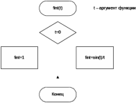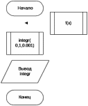 Условием окончания поиска корня является (b-a)/2n 4. Проверка условий сходимости методов Интегрирование по методу Симпсона Для вычисления по методу Симпсона требуется, чтобы функция была непрерывной на отрезке интегрирования. sin(t)/t=1 при t=0 по первому замечательному пределу, однако при вычислении в QBasic будет выдавать ошибку деления на ноль, поэтом в точке t=0 приравняем 1 искусственно. Условие для вычисления по методу Симпсона выполняется. Отыскание корня нелинейного уравнения методом половинного деления: Условие f(a)*f(b)<0 выполняется при x=[0;5], Условие единственности корня (sign (f `(x))= const при x=[a;b]) выполняется при x e [0;3]. На отрезке x=[3.3; 2*р] есть ещё один корень, поэтому сократим отрезок неопределённости до [0; 3] (с учетом условия метода Симпсона). 5. Тестирование программных модулей 5.1 Тестирование модуля численного интегрирования Для тестирования модуля, вызовем его для отыскания интеграла 5.1.1 Схема алгоритма тестирующей программы: Схема алгоритма управляющей программы: Схема алгоритма f(x): Схема алгоритма модуля численного интегрирования при тестировании: 5.1.2 Код тестирующей программы: DECLARE function integr (afix,x,E) DECLARE FUNCTION fint (x) CLS PRINT "Itog"; E; integr(0,1,0.001) END FUNCTION fint (t) fint = EXP(t) END FUNCTION FUNCTION integr (afix, x, E) aint = afix: bint = x nint = 2: h = (bint - aint) / 2: s = (fint(aint) + 4 * fint((aint + bint) / 2) + fint(bint)) * (h / 3) DO nint = 2 * nint: h = (bint - aint) / nint: s1 = s: cin = 4: x = aint: s = fint(aint) + fint(bint) FOR i = 1 TO nint - 1 x = x + h: s = s + cin * fint(x): cin = 6 - cin NEXT i s = s * h / 3 LOOP UNTIL ABS(s - s1) < E integr = s END FUNCTION 5.1.3 Результат тестирования: Модуль отработал верно: при точности Е=0.001, I=1.718283, отрезок интегрирования разделился на 4, шаг h=0.25 5.2 Тестирование модуля поиска корня уравнения методом половинного деления Протестируем модуль поиска корня уравнения на примере f(x)=1-x. В качестве отрезка неопределённости возьмём x=[-1;2] . Очевидно, что корень этого уравнения находится в x=1. 5.2.1 Схема алгоритма тестирующей программы: Схема алгоритма управляющей программы: Схема алгоритма модуля поиска корня уравнения методом половинного деления при тестировании: Схема алгоритма модуля fint(t): 5.2.2 Код тестирующей программы: DECLARE FUNCTION fint (t) DECLARE FUNCTION uravn (afix, bfix, E) CLS PRINT uravn(-1, 2, .001) END FUNCTION fint (t) fint = 1 - t END FUNCTION FUNCTION uravn (afix, bfix, E) aur = afix: bur = bfix: cur = (aur + bur) / 2: n = 0 PRINT TAB(10); "Promezhutochnie dannie" PRINT " a b f(a) f(b) b-a" DO UNTIL (bur - aur) <= E n = n + 1 IF fint(cur) * fint(bur) < 0 THEN aur = cur ELSE bur = cur PRINT USING "##.## ##.## ##.### ##.### ##.###"; aur; bur; fint(aur); fint(bur); bur - aur cur = (aur + bur) / 2 LOOP uravn = cur END FUNCTION 5.2.3 Результат тестирования Модуль отработал верно. 5.3 Прогонка программы Протестируем главный модуль, задав Отрезок неопределённости x=[0;3] Очевидно, что корень находится в x=2. Проверим это. 5.3.1 Схема алгоритма программы при прогонке: 5.3.2 Код программы при прогонке: DECLARE FUNCTION fint (t) DECLARE FUNCTION integr (afix, x, E) DECLARE FUNCTION uravn (afix, bfix, E) CLS LOCATE 1, 15 PRINT "Kursovaya rabota po informatike OTLADKA" LOCATE 2, 18 PRINT "Gruppa PS0601, Kudlo Alexey" LOCATE 4, 10 afix = 0: bfix = 3: E = .001 PRINT TAB(14); "Znacheniya f(x) na [a;b]" PRINT TAB(19); "x f(x)" FOR i = 0 TO 10 PRINT USING " ##.### ##.####"; i * .3; integr(0, i * .3, .0001) NEXT i xx = uravn(afix, bfix, E) PRINT PRINT TAB(5); "Iskomij koren` x*="; xx; " bil najden s tochnost`ju E="; E END FUNCTION fint (t) fint = 1 END FUNCTION FUNCTION integr (afix, x, E) aint = afix: bint = x nint = 2: h = (bint - aint) / 2: s = (fint(aint) + 4 * fint((aint + bint) / 2) + fint(bint)) * (h / 3) DO nint = 2 * nint: h = (bint - aint) / nint: s1 = s: cin = 4: x = aint: s = fint(aint) + fint(bint) FOR i = 1 TO nint - 1 x = x + h: s = s + cin * fint(x): cin = 6 - cin NEXT i s = s * h / 3 LOOP UNTIL ABS(s - s1) < E x = bint integr = s - 2 END FUNCTION FUNCTION uravn (afix, bfix, E) aur = afix: bur = bfix: cur = (aur + bur) / 2 PRINT PRINT TAB(15); "Promezhutochnie dannie pri poiske kornya" PRINT PRINT TAB(12); "a b f(a) f(b) b-a" DO UNTIL bur - aur <= E IF integr(afix, cur, E) * integr(afix, bur, E) < 0 THEN aur = cur ELSE bur = cur PRINT USING " ##.## ##.## ##.### ##.### ##.###"; aur; bur; integr(afix, aur, E); integr