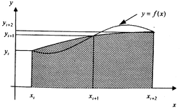 На отрезке [xi;xi+2] длиной 2h строится парабола, проходящая через три точки (xi;yi), (xi+1;yi+1), (xi+2;yi+2). Площадь под параболой, заключённой между осью абсцисс и прямыми x=xi, x=xi+2, принимают равной интегралу