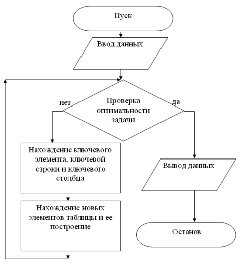 cout<<“Введите количество строк и столбцов”< cin>>a>>b; //заполнение начальной матрицы for (i=0;i { for (j=0;j {cout<<”Введите [”< cin>>tab[i][j]; }} cout<<”первая итерация”< for (i=0;i { for (j=0;j //проверка на оптимальность k: l=0; for (i=0;i if (tab[a-1][i]<0) {l=l+1;}} if (l==0){ for (j=1;j int kol=0,nol=0,ind; for (i=0;i if (tab[i][j]==1) {kol++;ind=i;} else nol++; } if ((kol==1) && (a-nol==2)) cout<<”x=”< }cout<<”Решение оптимально”< for (i=0;i { for (j=0;j {cout< cout<<”F(x)=”< return 0;} x=1000; //поиск ключевого столбца for (i=1;i { if (tab[a-1][i]<=x) {x=tab[a-1][i]; stl=i; }} //поиск ключевой строки for (j=0;j { if (tab[j][stl]>0) c[j]=tab[j][0]/tab[j][stl]; else c[j]=1000;} cout< cout<<”Массив для нахождения ключевой строки”< for (j=0;j cout< } cout< for (i=0;i<(a-1);i++) if (c[i] min=c[i]; str=i; } cout< cout<<”Kлючевой столбец и ключевая строка”< cout< cout< cout<<“Ключевой элемент:”< cout< //пересчет новой таблицы