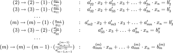 1) На первом этапе осуществляется так называемый прямой ход, когда путём элементарных преобразований над строками систему приводят к ступенчатой или треугольной форме, либо устанавливают, что система несовместна. А именно, среди элементов первого столбца матрицы выбирают ненулевой, перемещают его на крайнее верхнее положение перестановкой строк и вычитают получавшуюся после перестановки первую строку из остальных строк, домножив её на величину, равную отношению первого элемента каждой из этих строк к первому элементу первой строки, обнуляя тем самым столбец под ним. После того, как указанные преобразования были совершены, первую строку и первый столбец мысленно вычёркивают и продолжают пока не останется матрица нулевого размера. Если на какой-то из итераций среди элементов первого столбца не нашёлся ненулевой, то переходят к следующему столбцу и проделывают аналогичную операцию.