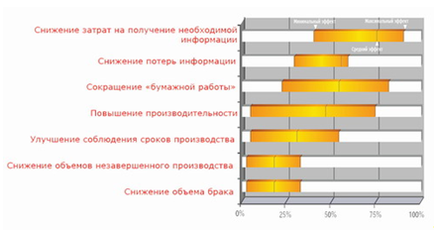 С момента внедрения первых MES-систем накоплена богатая статистика, которая позволяет оценить эффект от внедрения решений подобного класса. По данным MESA International эффект от внедрения MES-системы оценивается следующими показателями:
