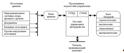 В состав системы поддержки принятия решений входят три главных компонента: база данных, база моделей и программная подсистема, которая состоит из системы управления базой данных (СУБД), системы управления базой моделей (СУБМ) и системы управления интерфейсом между пользователем и компьютером.