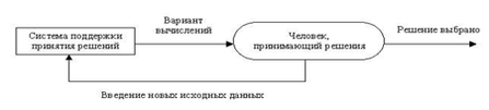 Главной особенностью информационной технологии поддержки принятия решений является качественно новый метод организации взаимодействия человека и компьютера. Выработка решения, что является основной целью этой технологии, происходит в результате итерационного процесса (рис. 3.15), в котором участвуют: система поддержки принятия решений в роли вычислительного звена и объекта управления; человек как управляющее звено, задающее входные данные и оценивающее полученный результат вычислений на компьютере.