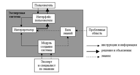 Основными компонентами информационной технологии, используемой в экспертной системе, являются (рис. 3.17): интерфейс пользователя, база знаний, интерпретатор, модуль создания системы.