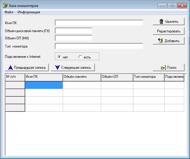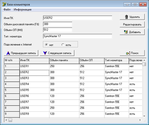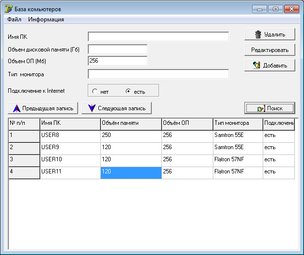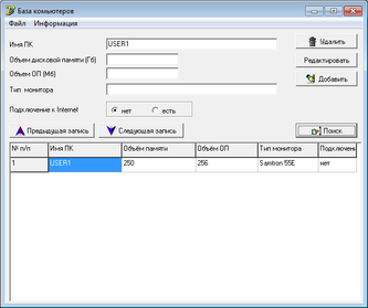При помощи кнопок «Предыдущая запись» и «Следующая запись» можно перемещаться между записями о компьютерах. Если необходимо изменить данные о каком то компьютере, то необходимо перейти на запись о нем, изменить соответствующие данные в индивидуальных полях, а потом нажать на кнопку «Обновить». Запись этого компьютера в массиве будет изменена.