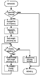 Эта процедура является обработчиком события onClick для объектa NOpen, то есть запускается при щелчке на указанном объекте. В теле этого вызывается стандартный диалог открытия файла, в случае, если диалог был завершен успешно, имя файла сохраняется в переменной FName, производится чтение содержимого исходного файла в массив AComp, а затем его содержимое выводится на форму при помощи процедуры ShowAComp. Алгоритм процедуры приведен на рисунке А.2.