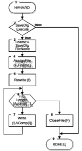 Эта процедура является обработчиком события onClick для объектa NSaveAs, то есть запускается при щелчке на указанном объекте. В теле этого вызывается стандартный диалог сохранения файла, в случае, если диалог был завершен успешно, имя файла сохраняется в переменной FName, производится сохранение содержимого массива AComp в файл с указанным именем. Алгоритм процедуры приведен на рисунке А.3.
