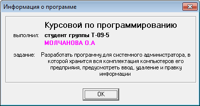 Данный курсовой проект был выполнен в полном соответствии поставленному заданию и отлажен в среде DELPHI 7.0. В ходе выполнения курсовой работы была разработана программа для обработки типизированных файлов, а также создан визуальный интерфейс для создания и ведения базы о компьютерах предприятия.