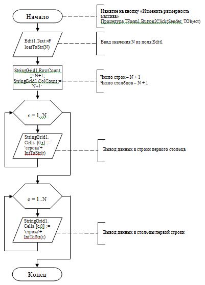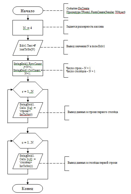 При запуске программы возникает событие «создание формы» (OnCreate), процедура TForm1.FormCreate(Sender: TObject). При этом задается количество строк и столбцов двумерного массива (по умолчанию 4 и 4) StringGrid1.RowCount := N+1; StringGrid1.ColCount := N+1; но ячейки первой строки и первого столбца не редактируемые, они используются для вывода надписей над строками и столбцами, для чего используются функции StringGrid1.Cells [0,r] := ' r = ' + IntToStr(r) и StringGrid1.Cells [c,0] := ' c = ' + IntToStr(c). Вывод данных поочередно в каждую из этих ячеек производится посредством стандартной инструкции for … to … do begin … end.