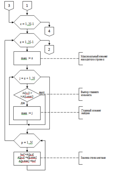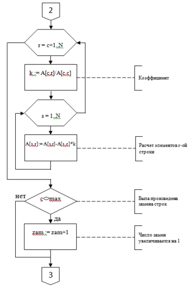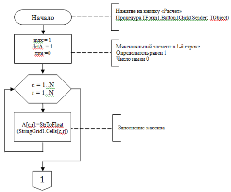 возникает событие (OnClick), процедура TForm1.Button1Click(Sender: TObject). Задаются начальные значения переменных max:= 1, detA := 1, zam:=0. Производится заполнение массива (A[c,r]:=StrToFloat(StringGrid1.Cells[c,r])), свойство StringGrid1.Cells[c,r] определяет содержимое ячейки с табличными координатами (c,r), строковые значения переменных, находящихся в ячейках (c,r) преобразуются в вещественный тип посредством стандартной инструкции StrToFloat. Стандартная инструкция for … to … do begin … end позволяет выполнять несколько раз действия, заключенные в этой инструкции. Функция abs(A[c,j]) возвращает модуль аргумента.