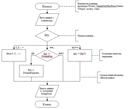 На рисунке 3 представлен алгоритм работы программы при вводе данных с клавиатуры (событие OnKeyPress). Процедура TForm1.StringGrid1KeyPress(Sender: TObject; var Key: Char).