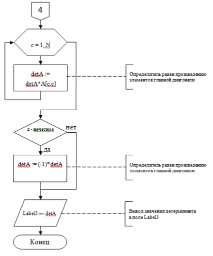 Инструкция if (stringgrid1.cells [c,r] > stringgrid1.cells [c-1,r]) and (stringgrid1.cells [c,r] < stringgrid1.cells [c+1,r]) then begin k := k+1; end; используется для выбора одного из вариантов развития программы, т.е. в случае выполнения данного условия число «особых» элементов увеличивается на 1 (k := k+1), если нет, то цикл повторяется до предпоследнего элемента матрицы. Реализует этот выбор стандартная инструкция for … to … do begin … end. Так как переменная detA действительное число, то для ее преобразования в строковый вид используется инструкция FloatToStrF(detA,fffixed,6,3). Функция zam mod 2 – проверка на четность количества замен строк, если число нечетное, то определитель умножается на -1.