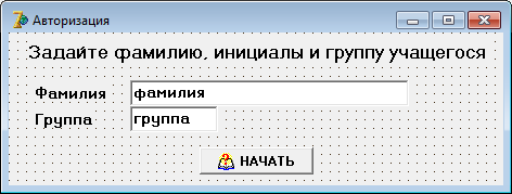 | Label1 | TLabel | надпись «Задайте фамилию, инициалы и группу учащегося» |