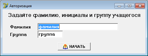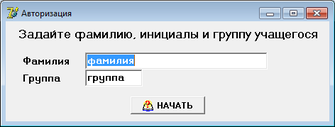 В этом окне учащийся должен задать свою фамилию и группу, после чего нажать на кнопку с надписью «НАЧАТЬ». После этого появится вторая форма с тестовыми вопросами, изображенная на рисунке 4.2. Заметим, что порядок вопросов при каждом новом запуске случайный, поэтому содержание поля вопроса и ответом может быть иным.