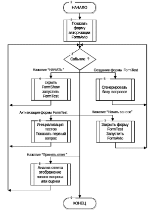 Составим алгоритм приложения, который представлен в приложении на рисунке A.1. На алгоритме приведены основные события экранных форм. В этом алгоритме: