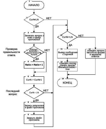 В теле процедуры выполняются следующие действия: Если текущий номер вопроса меньше общего количества вопросов, то формируется строка S c вопросом и выбранным ответом и записывается в файл протоколов f. Сравнивается выбранный номер ответа (RGroup1. ItemIndex) с номером правильного ответа (BasaV.test[curN].Korans) и, если он совпадает, то наращивается количество правильных ответов Ratio. Наращивается номер текущего вопроса curN. И очередной вопрос с вариантами ответов выводится на форму.