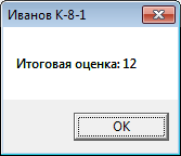 Появится новый вопрос, ответ на который реализуется аналогичным способом. Если были пройдены все вопросы, выводится сообщение с оценкой, которая пропорциональна количеству правильных ответов. Все ответы правильные – оценка равна 12. Все ответы неправильные – оценка равна 0. Пример окна с сообщением об оценке приведено на рисунке 4.3.
