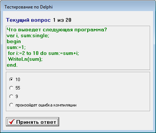 | BitBtn1Click | + | анализ введенного ответа и вывод очередного вопроса или итоговой оценки | 183–228 |