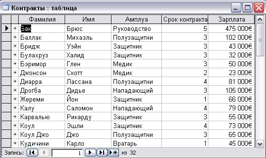 3.Таблица «Контракты»: содержит сведения о зарплате, сроке окончания контракта. Контракты: Фамилия, Имя, Амплуа, Срок контракта, Зарплата (Таблица 3)