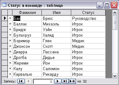 Таблица «Статус в команде»: содержит сведения о статусе всех членов команды: Фамилия, Имя, Статус.(Таблица 1.)