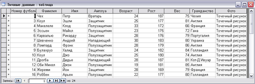 2.Таблица «Личные данные»: содержит сведения о всех параметрах игроков, включая и фотографии. Личные данные включают в себя: Номер футболки, Фамилия, Имя, Амплуа, Возраст, Рост, Вес, Гражданство, Фото (Таблица 2)
