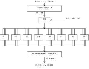 Функции f называется функцией шифрования. Ее аргументами являются последовательность Ri-1, получаемая на предыдущем шаге итерации, и 48-битовый ключ Ki, который является результатом преобразования 64-битового ключа шифра К.