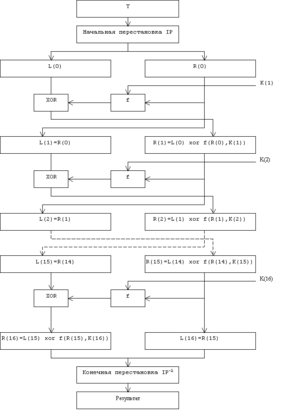 Затем выполняется итеративный процесс шифрования, состоящий из 16 циклов. Пусть Ti-результат I-й итерации: