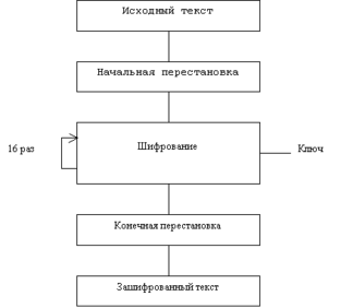 Алгоритм DES также использует комбинацию подстановок и перестановок. DES осуществляет шифрование 64-битных блоков данных с помощью 64-битового ключа, в котором значащими являются 56 бит (остальные 8 бит-проверочные биты для контроля на четность). Дешифрование в DES является операцией, обратной шифрованию, и выполняется путем повторения операций шифрования в обратной последовательности. Обобщенная схема процесса шифрования в алгоритме DES показана на рисунке 1.