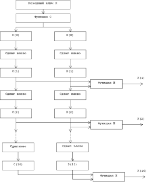 Результат преобразования G(K) разбивается на два 28-битовых блока C0 и D0, причем C0 будет состоять из битов 57, 49, ..., 44, 36 ключа K, а D0 будет состоять из битов 63, 55, ..., 12, 4 ключа K. После определения C0 и D0 рекурсивно определяются Ci и Di, i=1...16. Для этого применяют циклический сдвиг влево на один или два бита в зависимости от номера итерации, как показано в таблице 7.