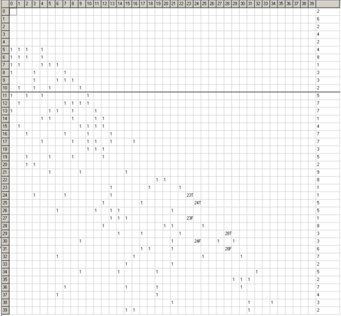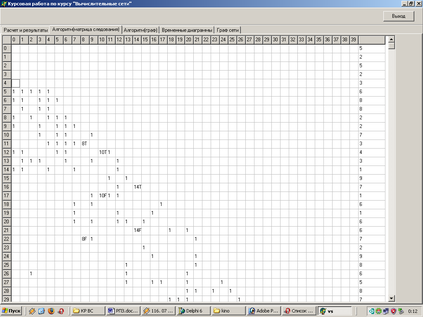Содержит сгенерированную матрицу следования алгоритма. В крайнем правом столбце приведены веса операторов, веса связей не приводятся, что бы можно было легче анализировать матрицу визуально.