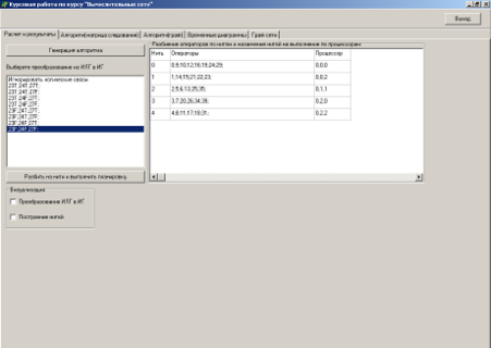 1. Вкладка генерации информационного графа алгоритма и результатов выполнения разбиения алгоритма на нити. (рис.2).