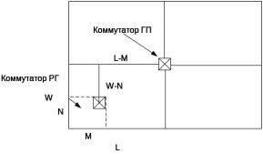 Рассмотрим другое расположение коммутатора РГ (рисунок 2). Коммутатор РГ расположен в центре РГ. Это увеличивает расстояние до коммутатора ГП на (N+M)/2, а средняя длина ЛС внутри РГ равна: