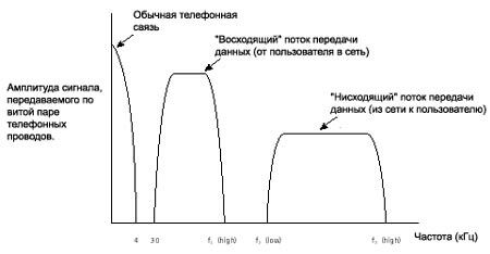 Технология ADSL использует метод разделения полосы пропускания медной телефонной линии на несколько частотных полос (также называемых несущими). Это позволяет одновременно передавать несколько сигналов по одной линии. Кроме этого может применяться технология эхокомпенсации (Echo Cancellation), при использовании которой диапазоны "восходящего" и "нисходящего" потоков перекрываются (смотрите рисунок 5) и разделяются средствами местной эхокомпенсации.