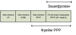 Кадр PPP, содержащий IP - датаграмму заключается в оболочку с заголовком GRE (Generic Routing Encapsulation) и заголовком IP. В заголовке IP-адреса источника и приемника соответствуют VPN-клиенту и VPN-серверу.