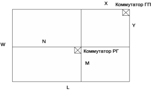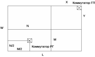 На рисунках 1 и 2 X и Y – расстояние между коммутаторами ГП и РГ по длине и ширине здания соответственно, N*M – габариты РГ, W и L – габариты прямоугольной области, противоположными точками которых являются коммутатор ГП и наиболее удаленная от него РС РГ. Габариты W и L описывают так называемую зону охвата коммутатора ГП и будут использованы в п. 3.1.2 при построении математической модели ГП.