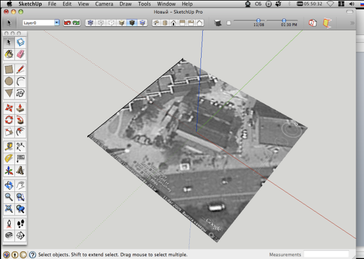 Для импорта требуемого участка рельефа необходимо в Google Earth с помощью инструментов навигации выделить область, на которой будет строиться модель, для наилучшего качества изображения увеличив масштаб до предела. Для получения горизонтальной проекции необходимо нажать клавишу "R" на клавиатуре. Камера переключится на вид сверху, карта примет направление на север. В этот момент полезно проверить, отключен ли слой "3D-здания" (в левой части экрана). Переключившись на SketchUp, в меню "Инструменты" выбирается подменю "Google Планета Земля" и функция "Получить текущий вид" (Get Current View). В центре рабочего пространства SketchUp появится плоский черно-белый "снимок экрана". Импортировать снимок из Google Планета Земля можно также с помощью кнопки "Получить текущий вид". Подоснова импортируется в масштабе 1:1.