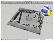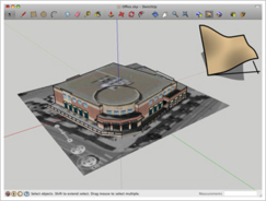 7. Чтобы увидеть трехмерный вариант снимка Google Планета Земля, выберите в SketchUp пункт "Инструменты" › "Google Планета Земля" › "Переключить местность" ("Toggle Terrain"). Поверхность, если она не плоская, станет объемной; рельеф будет соответствовать трехмерному ландшафту в Google Планета Земля.Рисунок отображается трёхмерным, когда кнопка нажата.