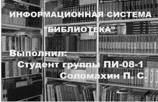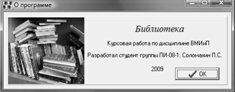 При запуске программного средства «Библиотека» вывод на дисплей монитора главной формы происходит параллельно с выводом стартовой формы, содержащей краткие сведения о названии информационной системы, фамилию и инициалы автора.