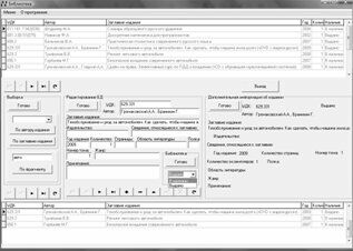При нажатии на кнопку «Выборка» или выборе соответствующего пункта меню становится видимым блок выборки из БД и невидимой — кнопка «Выборка». В этом блоке отображаются элементы, позволяющие при выборе первой буквы и нажатии на соответствующую кнопку выполнить выборку из БД по автору или заглавию издания. Также при вводе фрагмента заглавия издания, сведений, относящихся к заглавию, области литературы, жанра в поле ввода и нажатии на кнопку «По фрагменту» - произвести выборку записей, содержащих этот фрагмент. При нажатии на кнопку «Готово» блок выборки скрывается, становится видимой кнопка «Выборка».