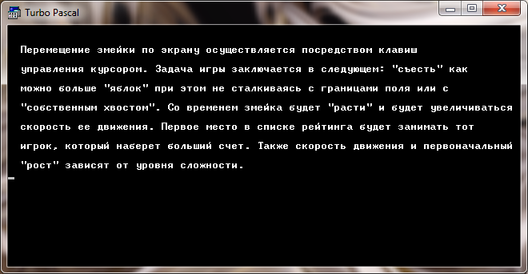 После выбора уровня сложности мы переходим к игровому полю. Управление змейкой осуществляется при помощи клавиш управления курсором. После того как игра закончилась, на экран выводится сообщение об этом и, если игрок набрал результат выше чем 10 место в списке рейтинга, предлагается ввести свое имя для сохранения результата. Далее осуществляется переход в главное меню. Это продолжается до тех пор, пока не буде нажата кнопка "Выход".