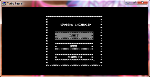 4. Выбрав меню "Играть", на экране появится меню выбора уровня сложности с 3 вариантами сложности "Глист", "Змея", "Анаконда". После выбора уровня сложности появится игровое поле и начнется игра. Справа от игрового поля будет находиться информация, отображающая набранный счет, длину змейки в знаках и тройка лидеров.