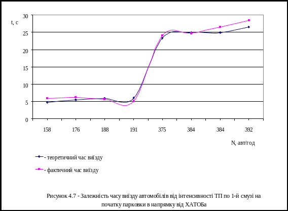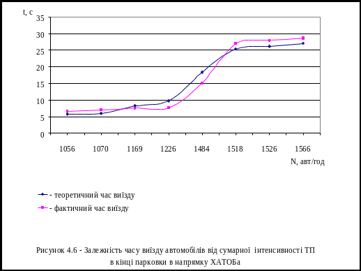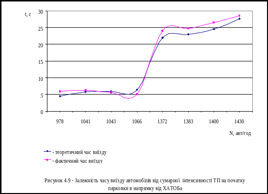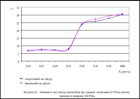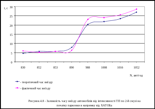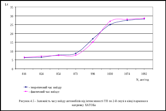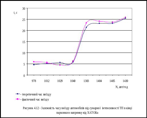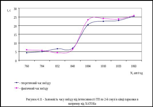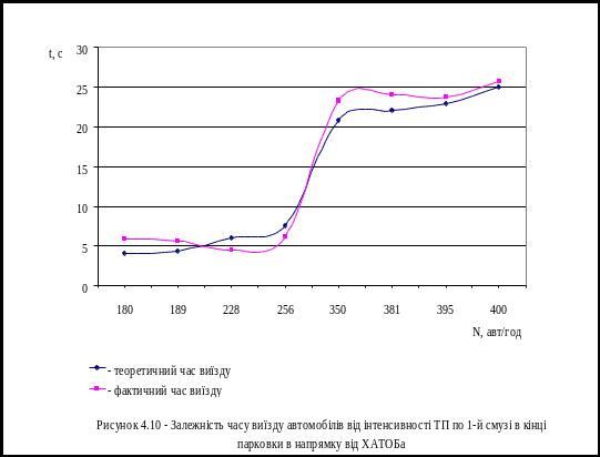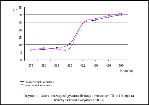 Таблиця 4.1 – Результати досліджень теоретичного і фактичного часу виїзду автомобілів в залежності від інтенсивності ТП по смугах руху