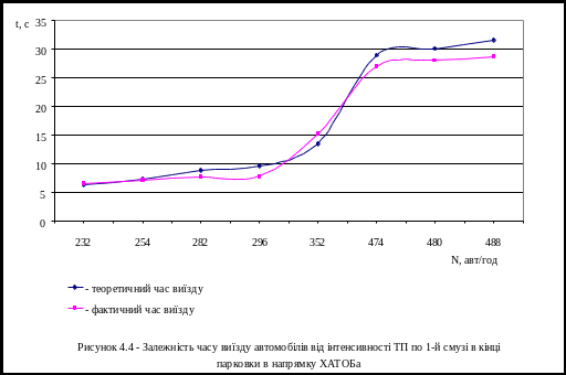 Спираючись на результати дослідження, які приведені в таблиці 4.1, за допомогою якої побудовані графіки часу виїзду автомобілів із парковки в залежності від інтенсивності транспортного потоку по смугах руху, що показані на рисунках 4.1-4.12 видно тісну залежність між цими параметрами.