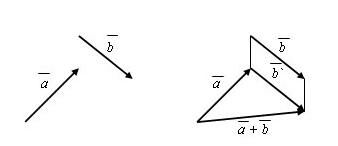 Пусть есть произвольные векторы a и b. Надо от конца вектора a отложить вектор b`, равный вектору b. Тогда вектор, начало которого совпадает с началом вектора a, а конец совпадет с концом вектора b`, будет суммой a + b.