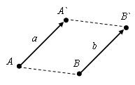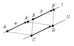 Пусть есть прямая l на которой лежат равные векторы AA` и BB`. A(x; y), A`(x`; y`), B(x1;y1) и B(x1`; y1`). Проведем прямую l1 параллельную l и отложим на ней вектор CD равный AA` и BB`, C (x0; y0) и D (x0`; y0`). Так как AA` = CD, из предыдущего пункта x-x`=x0-x0` и y-y`=y0-y0`. С другой стороны BB` = CD и x1-x1`=x0-x0`, y1-y1`=y0-y0`. Сравнивая равенства получаем x-x`=x1-x1` и y-y`=y1-y1`. Теорема доказана.