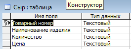 2. Щелкните на кнопке Конструктор в верхней области указанного окна, которая называется панелью инструментов, чтобы открыть таблицу в режиме конструктора.