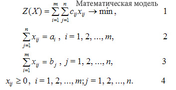 Математическая формулировка транспортной задачи такова: найти переменные задачи X=(xij), i=1,2,...,m; j=1,2,...,n, удовлетворяющие системе ограничений (цифра 2 на математической модели), условиям неотрицательности и обеспечивающие минимум целевой функции.