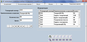 Затем создаем Form2, в ней будет представлена в табличном виде информация о выпускаемом ассортименте. Эта форма будет представлять ИС Автоматизации организации управления выбора поставщиков и потребителей (рис.17). Заказчик с помощью этой ИС сможет получить необходимые сведения как в целом о выпускаемом ассортименте, так и конкретно по видам продукции. Так у администраторов которые будут обслуживать эту ИС будет возможность оперативно добавить новые сведения, изменить их, или удалить.