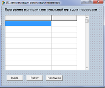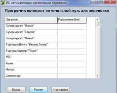 Нажав на кнопку Транспортировка, пользователь перейдет на третью форму ИС Автоматизации организации перевозок (рис.29). Перечень заказчиков представлен в табличном виде, необходимо лишь внести расстояние до каждого пункта. И после нажатия кнопки расчет клиенты будут расположены в порядке удаленности.